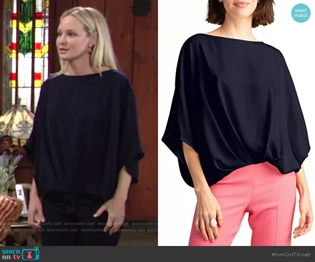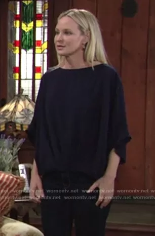 Sharon Newman (played by Sharon Case) on The Young and the Restless on CBS was spotted wearing this navy blue blouse on The Young and the Restless on Apr 28 2021's episode. Sharon's Top is the Coralline Top in Indigo by Trina Turk.