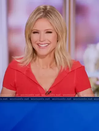 Sara Haines on The View on ABC was spotted wearing this red ribbed polo on The View on Apr 29 2021's episode. Sara's Sweater is the Daralee Ribbed Fitted Polo Sweater by Alice + Olivia.
