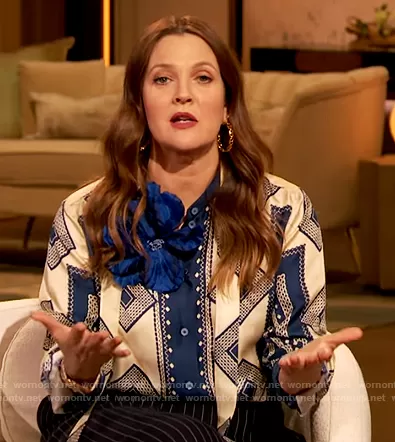 Drew Barrymore on The Drew Barrymore Show on CBS was spotted wearing this geometric print tie neck blouse on The Drew Barrymore Show on Oct 22 2021's episode. Drew's Top is the Geometric Print Tie Neck Silk Blouse by Runway Marc Jacobs.