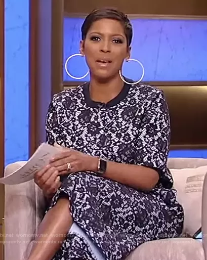 Tamron Hall on Tamron Hall Show on ABC was spotted wearing this blue floral lace top and pants on Tamron Hall Show on Apr 29 2021's episode. Tamron's Top is the Bonded corded lace and jersey sweatshirt by Adam Lippes . Tamron's Pants is the Bonded corded lace and jersey culottes by Adam Lippes.