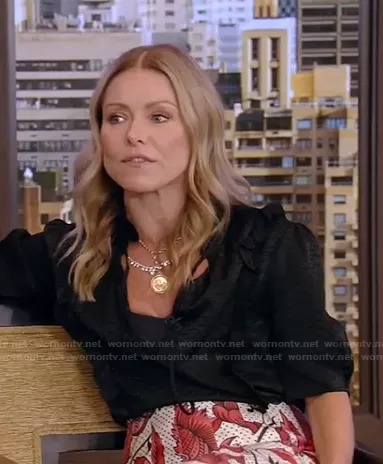 Kelly Ripa on Live with Kelly and Mark on Disney ABC Home Entertainment was spotted wearing this black top and floral pleated skirt on Live with Kelly and Ryan on Apr 29 2021's episode. Kelly's Top is the Talino Short Sleeve Silk Jacquard Top by Zadig & Voltaire . Kelly's Skirt is the Silk Skirt with Watercolor Flower Print by Gucci.