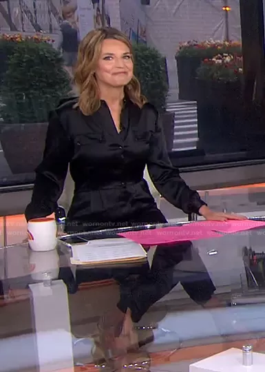 Savannah Guthrie on Today on NBC was spotted wearing this black satin jumpsuit on Today on Nov 19 2021's episode. Savannah's Jumpsuit is the Rosalie Jumpsuit by Anine Bing.
