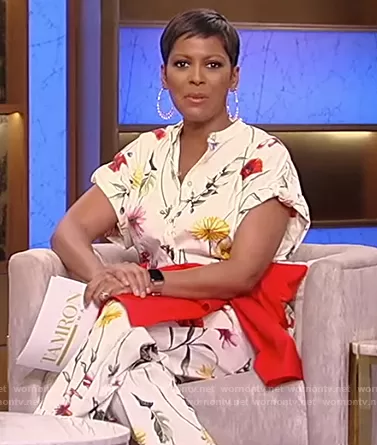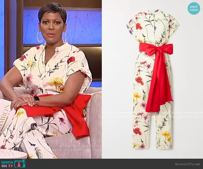 Tamron Hall on Tamron Hall Show on ABC was spotted wearing this white floral jumpsuit on Tamron Hall Show on Apr 30 2021's episode. Tamron's Jumpsuit is the Bow-detailed floral-print cotton-blend poplin jumpsuit by Oscar de la Renta.