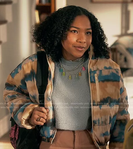 Delilah (played by Laya DeLeon Hayes) on The Equalizer on CBS was spotted wearing this tie dye puffer jacket on The Equalizer on episode 'The Milk Run' (1x05) in Mar 2021. Delilah's Jacket is the Zip Puffer Jacket in Yellow Blue Horizon Print by BP.
