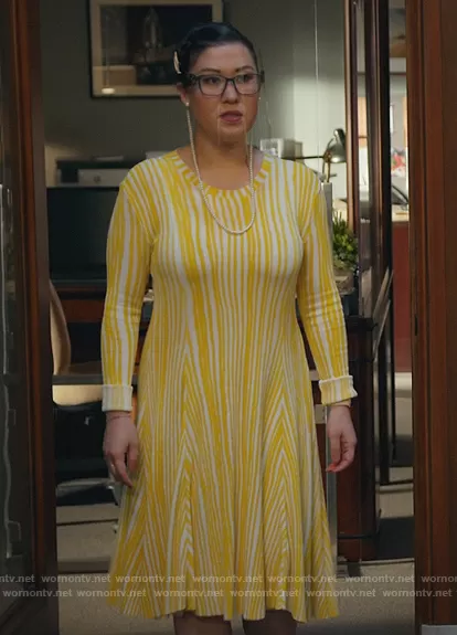 Sherri Kansky (played by Ruthie Ann Miles) on All Rise on OWN was spotted wearing this yellow striped ribbed dress on All Rise on episode 'Caught Up in Circles' (2x14) in May 2021. Sherri's Dress is the Stripe Knit Dress by Calvin Klein.