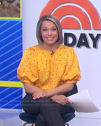 Dylan Dreyer on Today on NBC was spotted wearing this yellow floral puff sleeve top on Today on May 04 2021's episode. Dylan's Top is the Dainty Bloom Top by Kate Spade.