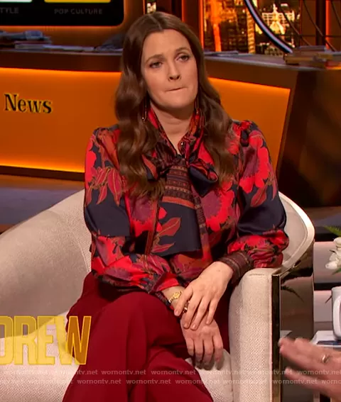 Drew Barrymore on The Drew Barrymore Show on CBS was spotted wearing this black and red floral print blouse on The Drew Barrymore Show on May 04 2021's episode. Drew's Pants is the Pleated Wide Leg Wool Trousers by Rosetta Getty.