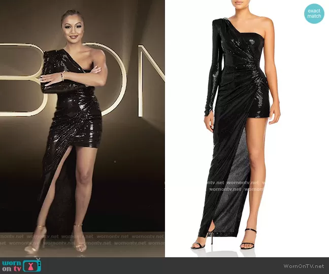 Eboni K. Williams on The Real Housewives of New York City on Bravo was spotted wearing this black one shoulder sequin dress on The Real Housewives of New York City on episode 'Back in the Big Apple' (13x01) in May 2021. Ebony's Dress is the Ruched Asymmetric Sequinned Gown by David Koma.