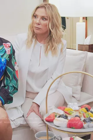 Ramona Singer on The Real Housewives of New York City on Bravo was spotted wearing this white keyhole blouse and blazer on The Real Housewives of New York City on episode 'Back in the Big Apple' (13x01) in May 2021. Ramona's Top is the Alana Bishop-Sleeve Blouse by Reiss . Ramona's Blazer is the Tally Collarless Open Jacket by Reiss . Ramona's Pants is the Joanne Pants by Reiss.