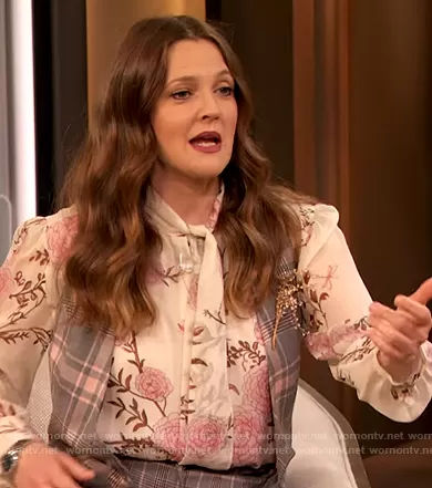 Drew Barrymore on The Drew Barrymore Show on CBS was spotted wearing this floral print tie neck blouse on The Drew Barrymore Show on May 05 2021's episode. Drew's Top is the Floral Print Silk Blouse by Giambattista Valli.