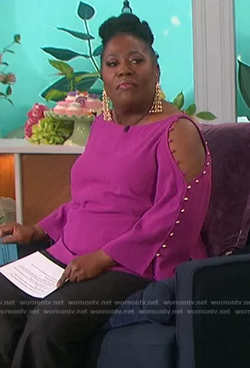 Sheryl Underwood on The Talk on CBS was spotted wearing this pink button sleeve top on The Talk on May 07 2021's episode. Sheryl's Top is the Button-Trim Cold-Shoulder Top by Trina Turk.