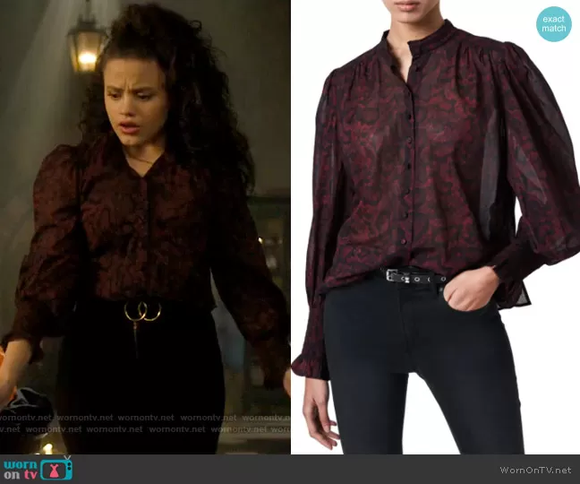 Maggie Vera (played by Sarah Jeffery) on Charmed on The CW was spotted wearing this red snake print blouse on Charmed on episode 'Witchful Thinking' (3x11) in May 2021. Maggie's Top is the Leonie Stanza Shirt by All Saints.