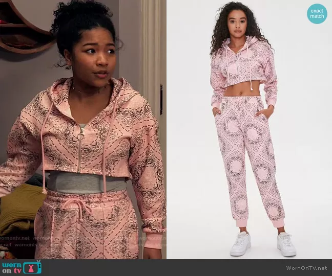 Delilah (played by Laya DeLeon Hayes) on The Equalizer on CBS was spotted wearing this pink printed hoodie and pants set on The Equalizer on episode 'Lifeline' (1x08) in May 2021. Delilah's Sweatshirt is the Paisley Print Hoodie by Forever 21 . Delilah's Pants is the Paisley Print Fleece Joggers by Forever 21.