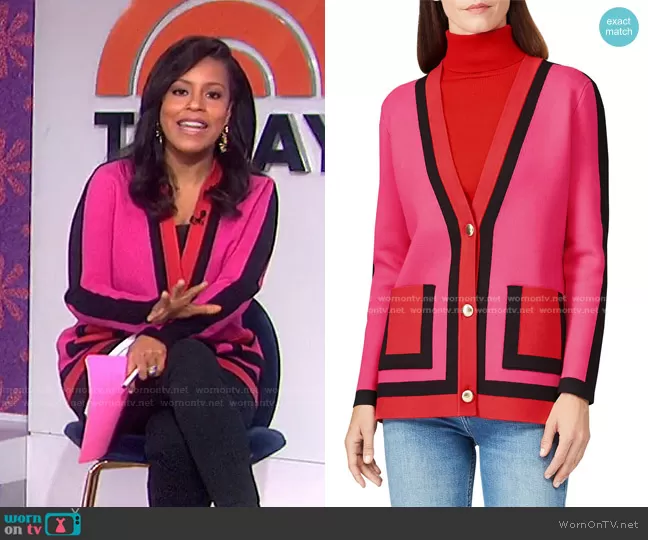Sheinelle Jones on Today on NBC was spotted wearing this pink colorblock cardigan on Today on May 10 2021's episode. Sheinelle's Sweater is the Viola Cardigan by Ronny Kobo.