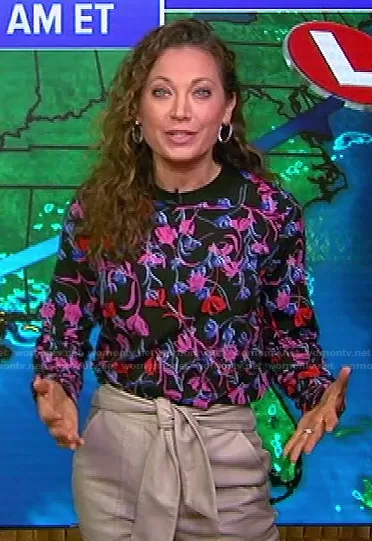 Ginger Zee on Good Morning America on ABC was spotted wearing this black floral top and tie waist pants on Good Morning America on May 10 2021's episode. Ginger's Top is the Tulip Floral Top by Thakoon Collective . Ginger's Pants is the Tessa Vegan Leather Pant by Jonathan Simkhai.
