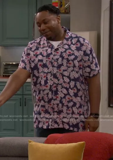 Marty (played by Marcel Spears) on The Neighborhood on CBS was spotted wearing this blue and red leaf print shirt on The Neighborhood on episode 'Welcome to the Invasion' (3x17) in May 2021. Marty's Shirt is the Leaf Print Camp Shirt by Sun + Stone.
