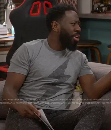 Malcom (played by Sheaun McKinney) on The Neighborhood on CBS was spotted wearing this grey bolt tee on The Neighborhood on episode 'Welcome to the Invasion' (3x17) in May 2021. Malcolm's Shirt is the Bolt Tee by Vestige.