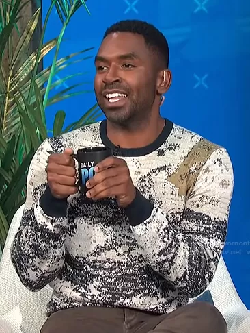 Justin Sylvester on E! News on E! was spotted wearing this printed knit sweater on E! News Daily Pop on May 11 2021's episode. Justin's Sweater is the Painted Crew Neck Sweater by Perry Ellis.