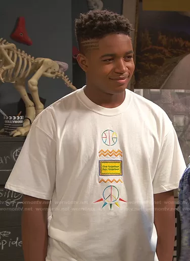 Booker Baxter (played by Issac Ryan Brown) on Ravens Home on Disney was spotted wearing this white embroidered tee on Ravens Home on episode 'American Torah Story' (4x15) in May 2021. Booker's Shirt is the Re-Issue Urban Jungle T-Shirt by Nike.