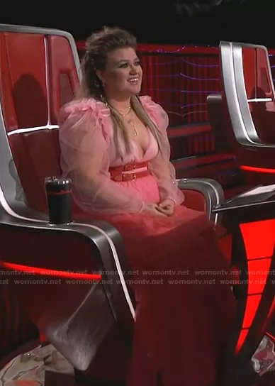 Kelly Clarkson on The Voice on NBC was spotted wearing this pink plunge neck tiered dress on The Voice on May 11 2021's episode. Kelly C's Dress is the Francoise Tulle Midi Dress by Love Shack Fancy . Kelly C's Belt is the Double-Buckle Leather Belt by Alexander McQueen.