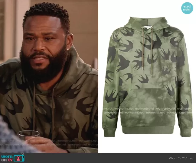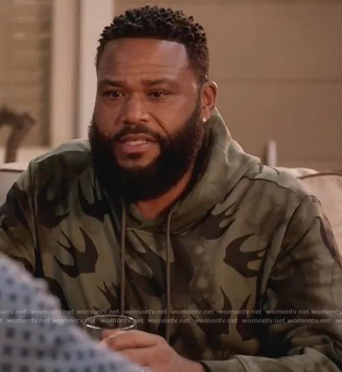Andre Johnson (played by Anthony Anderson) on Black-ish on ABC was spotted wearing this green swallow print hoodie on Black-ish on episode 'Snitches Get Boundaries' (7x18) in May 2021. Andre's Sweater is the Bird Print Hoodie by McQ Swallow.
