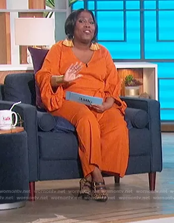 Sheryl Underwood on The Talk on CBS was spotted wearing this orange wrap jumpsuit on The Talk on May 12 2021's episode. Sheryl's Jumpsuit is the Puff Sleeve Linen Jumpsuit by Eloquii.