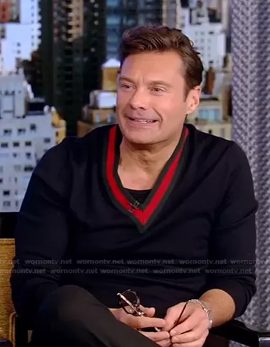 on Live with Kelly and Mark on Disney ABC Home Entertainment was spotted wearing this navy v-neck sweater on Live with Kelly and Ryan on Sep 13 2021's episode. 's Sweater is the Wool V-Neck Sweater with Web by Gucci.