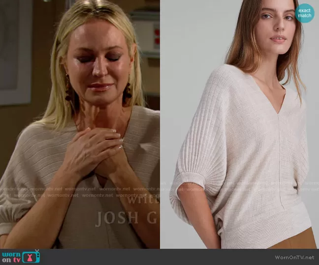 Sharon Newman (played by Sharon Case) on The Young and the Restless on CBS was spotted wearing this beige pleated v-neck sweater on The Young and the Restless on May 13 2021's episode. Sharon's Sweater is the Quarter Sleeve V-Neck Sweater in Tan by Club Monaco.