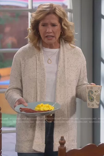 Vanessa Baxter (played by Nancy Travis) on Last Man Standing on Fox was spotted wearing this beige speckled cardigan on Last Man Standing on episode 'Murder, She Wanted' (9x19) in May 2021. Vanessa's Sweater is the Flecked Long Cardigan by Eileen Fisher.