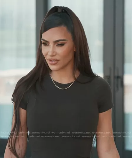 Kim Kardashian on Keeping Up with the Kardashians on E! was spotted wearing this black short sleeve top on Keeping Up with the Kardashians on episode 'Season of Change' (20x08) in May 2021. Kim's Bodysuit is the Cotton Jersey T-shirt Bodysuit by Skims.