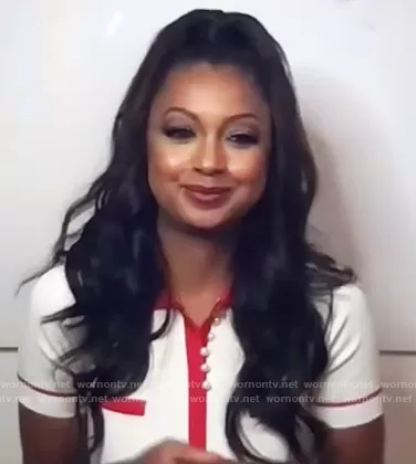 on The Real on BETher was spotted wearing this K Williams white and red pearl trim dress on The Real on May 14 2021's episode. 's Dress is the Tipped Short Sleeve Fit & Flare Knit Dress by Sandro.