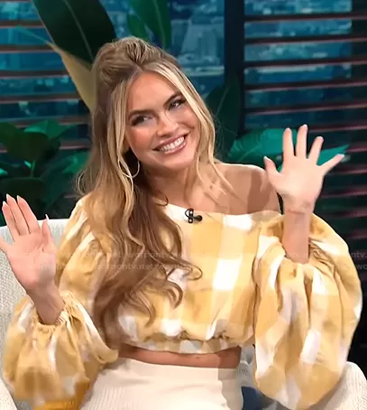 on E! News on E! was spotted wearing this yellow gingham cropped top on E! News Daily Pop on May 17 2021's episode. 's Top is the Sutherland Gingham Crop Top by Acler.