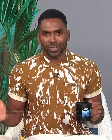 Justin Sylvester on E! News on E! was spotted wearing this camel abstract print polo shirt on E! News Daily Pop on May 18 2021's episode. Justin's Shirt is the Mirin Polo Shirt by Ted Baker.