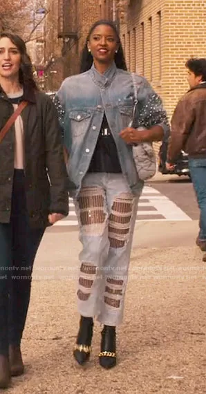 Wickie Roy (played by Renée Elise Goldsberry) on Girls5eva on Peacock was spotted wearing this pearl embellished denim jacket and distressed jeans on Girls5eva on episode 'Alf Musik' (1x03) in May 2021. Wickie's Jacket is the Embellished Denim Jacket by Sunset & Spring . Wickie's Jeans is the Sequin Straight Leg Jeans by Guess.