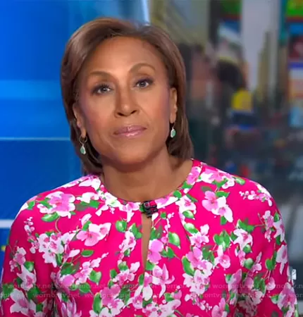 Robin Roberts on Good Morning America on ABC was spotted wearing this pink floral keyhole dress on Good Morning America on Mar 21 2023's episode. Robin's Dress is the Marilyn Floral Print Dress by Hobbs London.