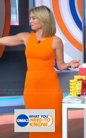Amy Robach on Good Morning America on ABC was spotted wearing this orange cropped tank and skirt on Good Morning America on May 19 2021's episode. Amy's Top is the Crop Hater Top by Zara