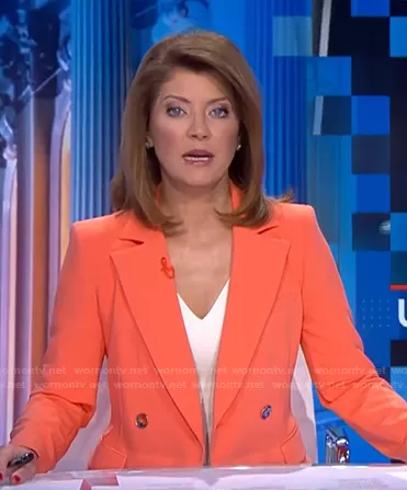Norah O'Donnell on CBS Evening News on CBS was spotted wearing this orange double breasted blazer on CBS Evening News on May 19 2021's episode. Norah's Jacket is the Double Breasted Cropped Blazer by Zara.