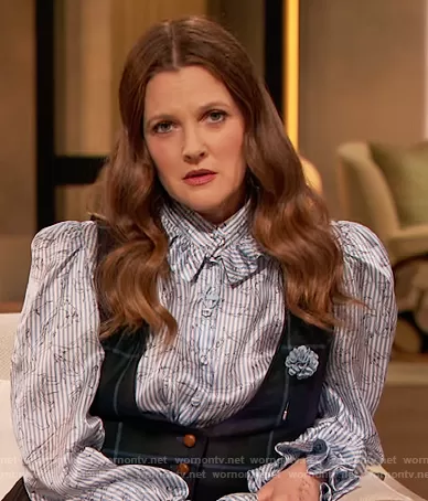 Drew Barrymore on The Drew Barrymore Show on CBS was spotted wearing this stripe ruffle blouse on The Drew Barrymore Show on May 20 2021's episode. Drew's Top is the Silk Medici Blouse by Prune Gold Schmidt.