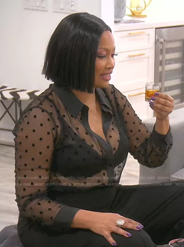 Garcelle Beauvais on The Real Housewives of Beverly Hills on Bravo was spotted wearing this black polka dot sheer blouse on The Real Housewives of Beverly Hills on episode 'Dressed to the 90210s' (11x01) in May 2021. Garcelle's Top is the Hailie Polka Dot Long-Sleeve Sheer Blouse by L'Agence . Garcelle's Pants is the Ponte Knit Wide Leg Pant by Ripley Rader .
