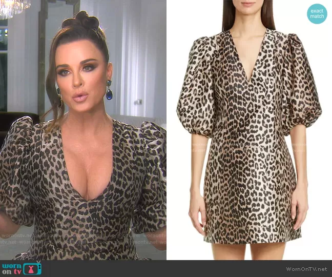 Kyle Richards on The Real Housewives of Beverly Hills on Bravo was spotted wearing this leopard puff sleeve dress on The Real Housewives of Beverly Hills on episode 'Dressed to the 90210s' (11x01) in May 2021. Kyle's Dress is the Leopard Jacquard Puff Sleeve Minidress by Ganni . Kyle's Earrings is the Sapphire-Color Crystal Double-Teardrop Earrings by Kenneth Jay Lane.