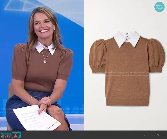 Savannah Guthrie on Today on NBC was spotted wearing this brown puff sleeve sweater and denim skirt on Today on May 21 2021's episode. Savannah's Sweater is the Chase Poplin-Trimmed Sweater by Alice + Olivia . Savannah's Skirt is the Trapunto Denim Midi Skirt by Frame.