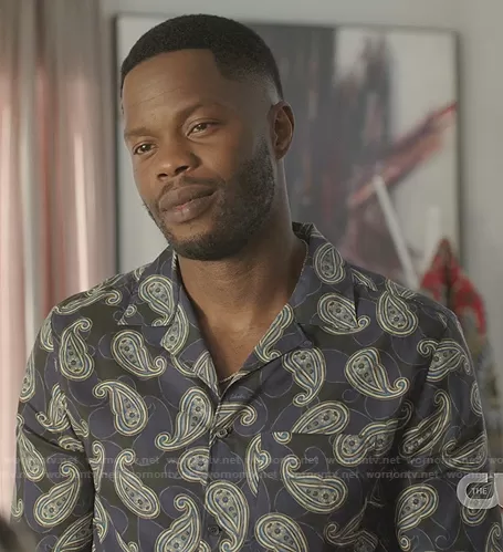 Jeff Colby (played by Sam Adegoke) on Dynasty on The CW was spotted wearing this paisley short sleeve shirt on Dynasty on episode 'The Aftermath' (4x03) in May 2021. Jeff's Shirt is the Paisley Print Cotton Shirt by Salvatore Ferragamo.