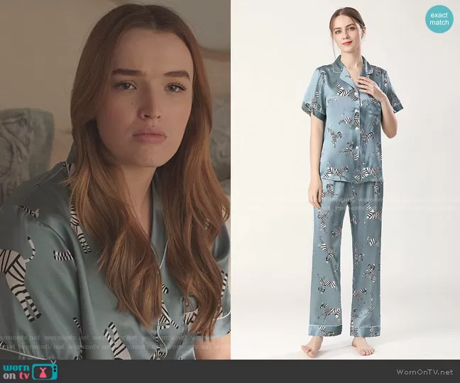 Kirby Anders (played by Maddison Brown) on Dynasty on The CW was spotted wearing this blue zebra print pajamas on Dynasty on episode 'The Aftermath' (4x03) in May 2021. Kirby's Pajama Set is the Silk Pajama Set Short Sleeve Zebra Silk Pjs by Slipintosoft.