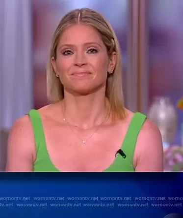 Sara Haines on The View on ABC was spotted wearing this green knotted sleeveless dress on The View on May 24 2021's episode. Sara's Dress is the Vera Dress by Cinq a Sept.