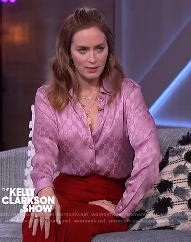 GG monogram printed shirt by Gucci worn by Emily Blunt on The Kelly Clarkson Show