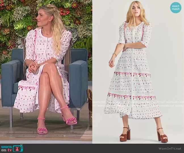 Amanda Kloots on The Talk on CBS was spotted wearing this white floral printed dress on The Talk on May 24 2021's episode. Amanda's Dress is the Flora Dress by Love Shack Fancy.