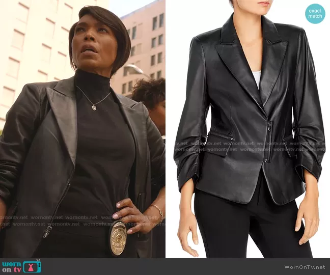 Athena Grant (played by Angela Bassett) on 9-1-1 on ABC was spotted wearing this black zip leather blazer on 9-1-1 on episode 'Survivors' (4x14) in May 2021. Athena's Jacket is the Caden Leather Blazer by Kobi Halperin.