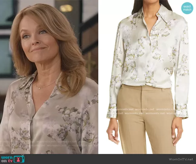 (played by ) on All American on CWTV was spotted wearing this green floral satin blouse on All American on episode 'Bring the Noise' (3x13) in May 2021. 's Top is the Hazy Blossom Long Sleeve Button-Up Silk Blouse by Vince.