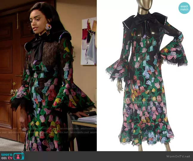 Zoe (played by Kiara Barnes) on The Bold and the Beautiful on CBS was spotted wearing this floral embroidered bell sleeve dress on The Bold and the Beautiful on May 25 2021's episode. Zoe's Dress is the Floral Dress by Gucci . Zoe's Earrings is the Divine Floral gold tone drop earrings by Ranjana Khan.