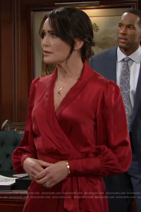 Quinn Fuller (played by Rena Sofer) on The Bold and the Beautiful on CBS was spotted wearing this red wrap dress on The Bold and the Beautiful on May 25 2021's episode. Quinn's Dress is the Ladybeetle Wrap Silk Midi Dress by Zimmermann.